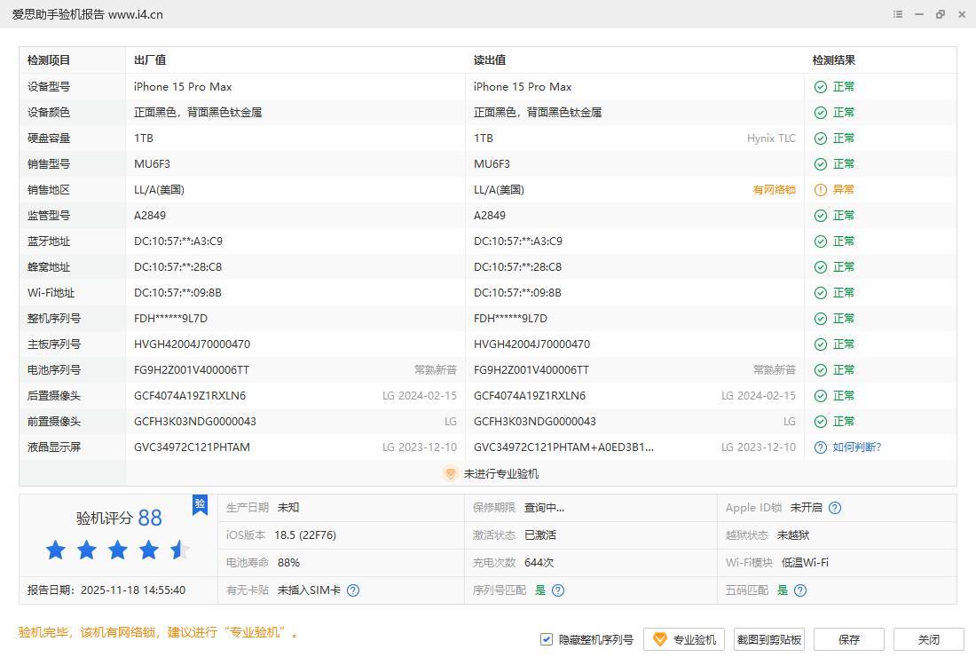 综合质检结果:已改MEP集成单卡、无维修、无进水、功能正常